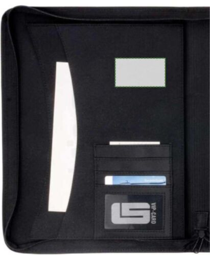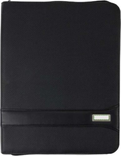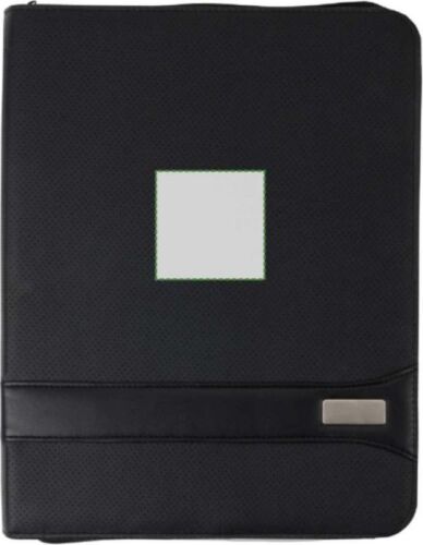 Portablocco formato +/- A4, 2 scomparti grandi interni, 4 vani porta carte di credito, passante elasticizzato per penna, blocco a righe, targhetta in metallo 4x,15 cm applicata sul fronte personalizzabile ad incisione laser, chiusura lampo, in PVC