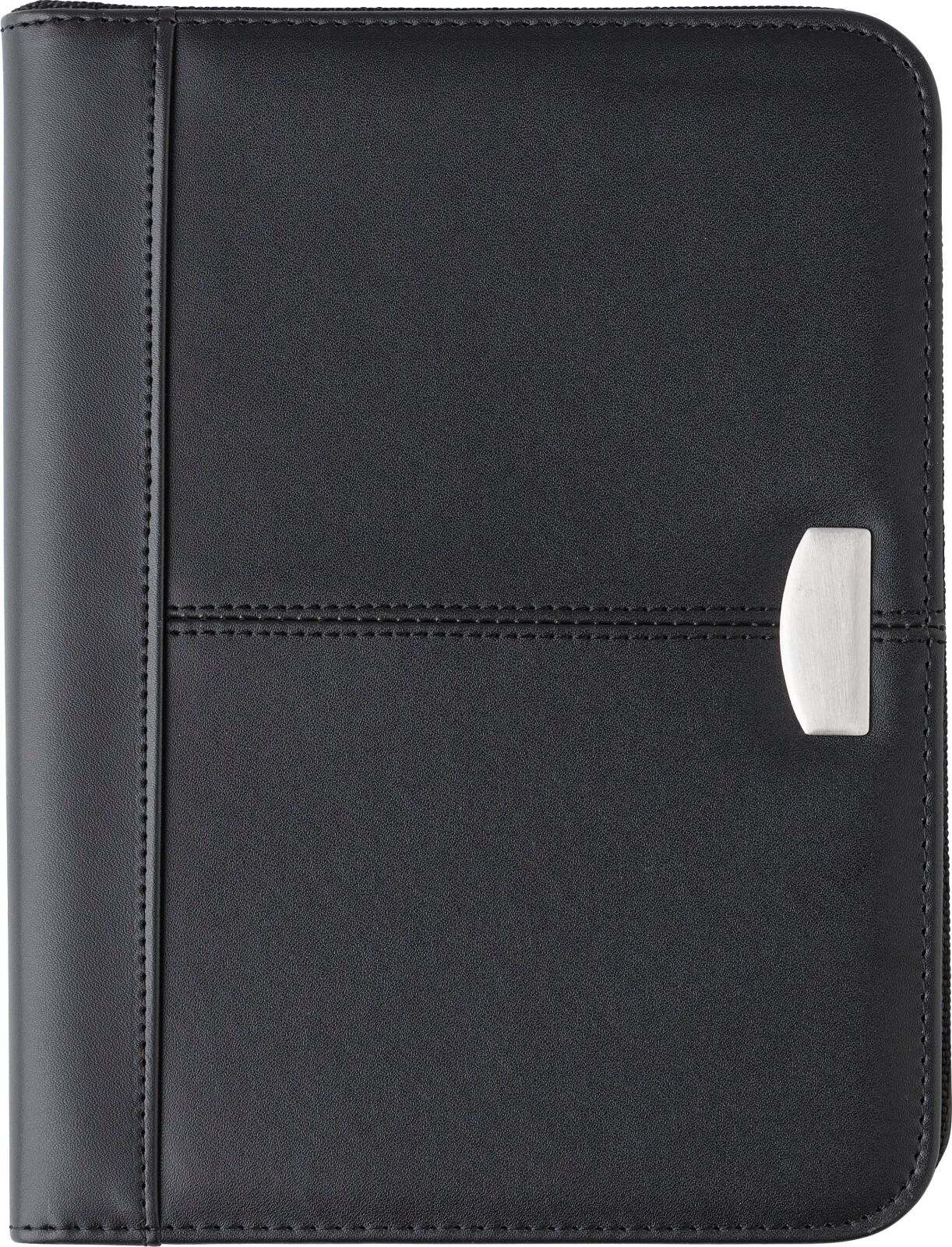 Portablocco formato +/- A5, chiusura lampo, targhetta in metallo, blocco con 25 pagine a righe incluso, passante per penna (non inclusa), in similpelle