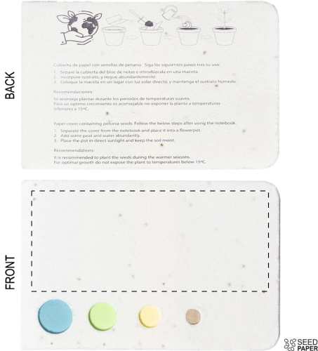Set 10 foglietti adesivi e 30 segnapagina (3 colori assortiti) in carta riciclata con copertina in carta di semi. La copertina contiene semi di petunia in colori assortiti, che possono essere piantati separando la copertina dal blocco.