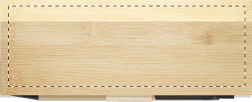 Scatola in bambù contenente blocchi con 220 foglietti adesivi (in 2 diversi colori), 550 segnapagina (in 5 diversi colori), un righello da 12 cm e una penna in cartoncino riciclato con refill blu.