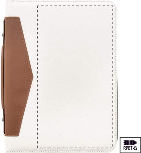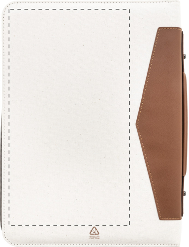 Cartella portadocumentiformato A4 in canvas riciclato e pelle PU riciclata, pratica impugnatura, molteplici scomparti interni e blocco note da 20 fogli in carta riciclata a righe. Materiale: 70% cotone riciclato e 30% poliestere RPET.
