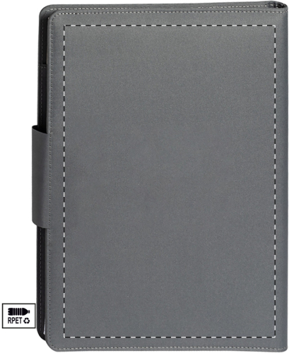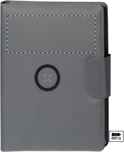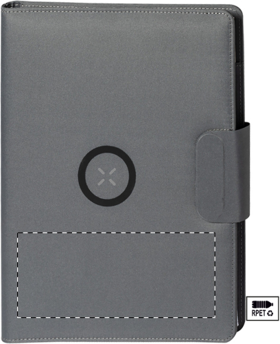 Cartella portadocumenti formato A4 in poliestere 300D RPET, con caricabatterie magnetico wireless rapido integrato (10W), power bank da 5000 mAh con porta di ricarica USB, supporto pieghevole per cellulare e blocco note da 20 fogli a righe. Comprende un anello metallico autoadesivo che permette l'utilizzo della funzione magnetica su qualsiasi dispositivo ricaricabile in modalità wireless. Fornito con cavo USB per la ricarica.