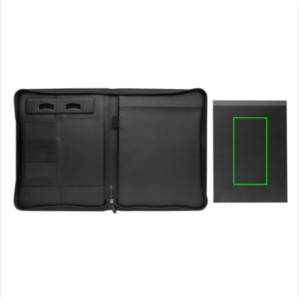 Portadocumenti deluxe tech con cerniera, elegante e di pregio è realizzato con materiali riciclati certificati RCS rPU. La certificazione RCS (Recycled Claim Standard) garantisce una filiera completamente certificata dei materiali riciclati. La superficie liscia e di pregio gli conferisce un aspetto elegante. Include un blocco A4 in carta riciclata da 64 gm/2 da 20 pagine. All'interno c'è 1 tasca per smartphone, un supporto per cellulare, un portapenna e 2 taschini per biglietti da visita. Realizzato in PU riciclato certificato RCS. Il materiale completamente riciclato corrisponde al 14% del peso totale dell'articolo. Senza PVC.