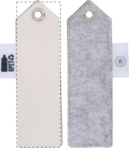 Segnalibro in feltro RPET personalizzabile con stampa a colori su fronte, cordino in PU ed etichetta RPET. Il costo comprende la stampa in sublimazione. MOQ: 100 pz.