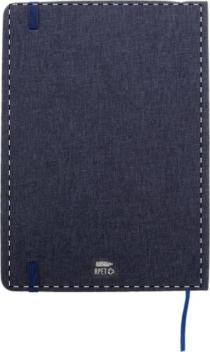 Quaderno formato A5 con copertina in poliestere RPET, con 80 fogli a righe in carta riciclata, inserto in bambù, funzione portacellulare, segnalibro ed elastico in gomma.