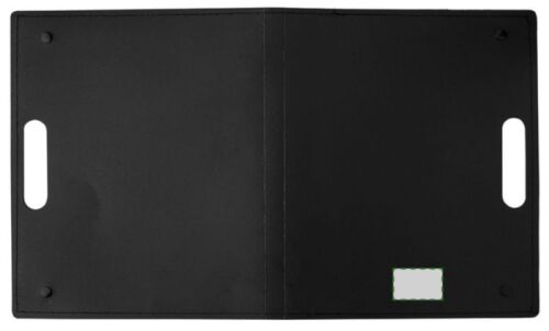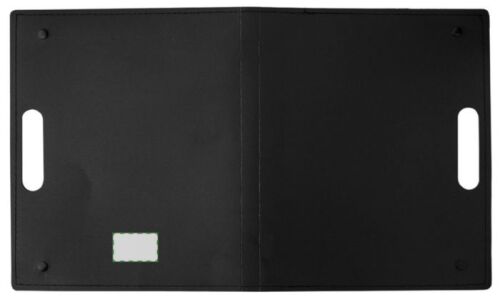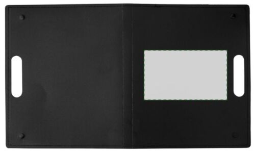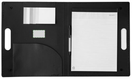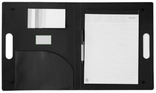 Cartella portadocumenti in cartone, block-notes con 20 pagine a righe, memo stick in vari colori, penna in cartone con corpo e clip in cartone, refill nero