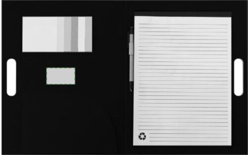 Cartella portadocumenti in cartone, include 150 memo stick in vari colori, block-notes a righe da 25 pagine, penna a sfera con corpo e clip in cartone, refill blu