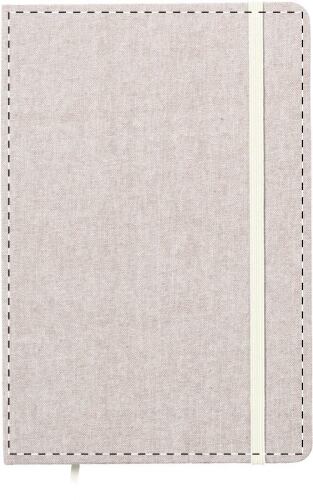 Quaderno formato A5 con copertina in 100% cotone riciclato, 100 fogli bianchi, segnalibro e fascetta in gomma.