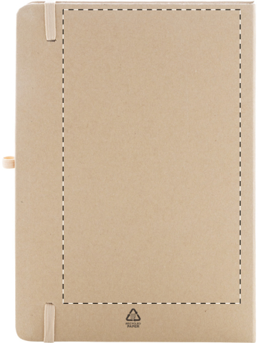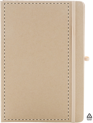 Quaderno formato A5 con copertina in cartoncino riciclato, 70 fogli in carta riciclata, elastico e portapenne. La copertina interna integra 25 foglietti adesivi, 125 segnapagina e una tasca portacarte.