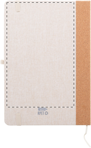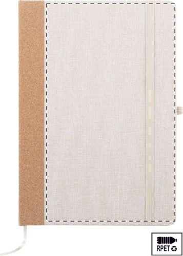 Quaderno formato A5 con copertina in poliestere RPET, dorso in sughero naturale, 80 fogli a righe in carta riciclata, segnalibro, elastico in gomma e portapenne.