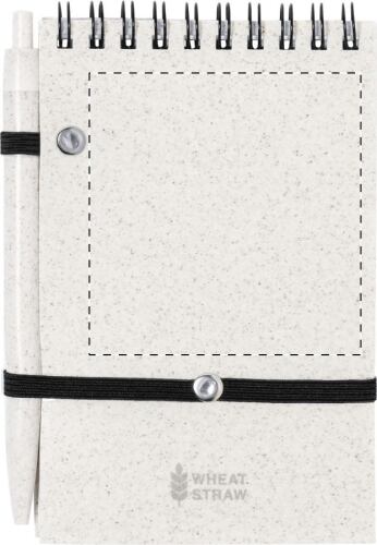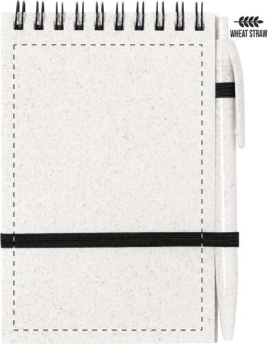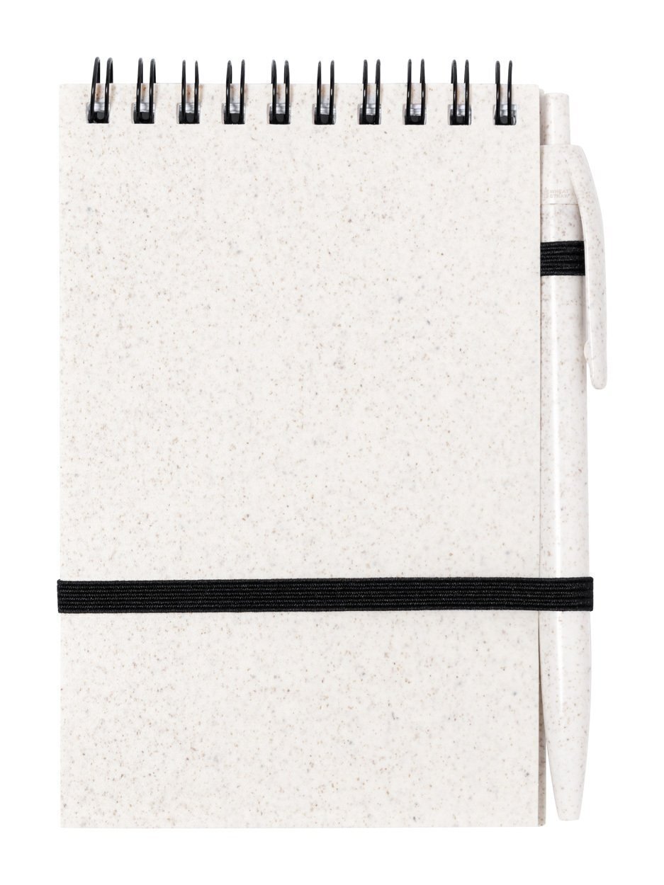 Quaderno a spirale con copertina in plastica ecologica in paglia di grano con cinturino in caucciù e 70 fogli in carta riciclata a righe. Comprende una penna a sfera in plastica di paglia di grano con refill blu.