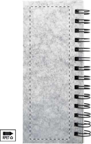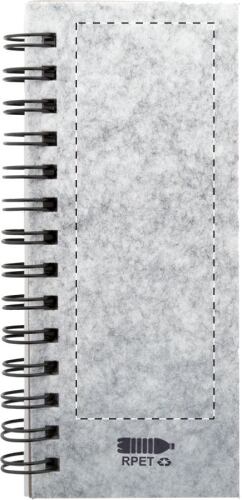 Blocco a spirale con copertina in feltro RPET, 40 fogli a righe in carta riciclata, 25 foglietti adesivi e 125 segnapagina (in 5 colori diversi).