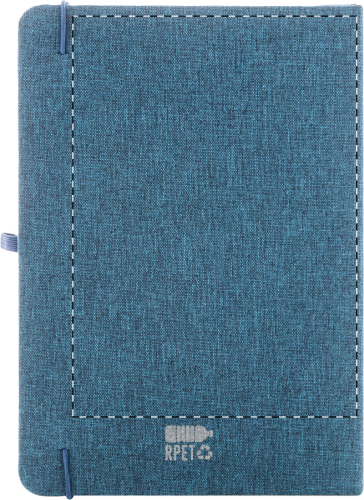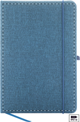 Quaderno formato A5 con 80 pagine bianche, copertina in poliestere 300D RPET, elastico colorato, segnalibro e porta penna.