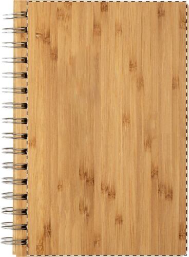 Quaderno a spirale formato A5 con copertina in bambù, 80 fogli a righe e penna a sfera in bambù con refill nero. Confezione in cartoncino.