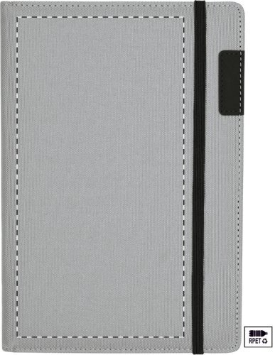 Quaderno formato A5 con copertina in poliestere 600D RPET, tasca con cerniera, elastico e 100 fogli a righe.
