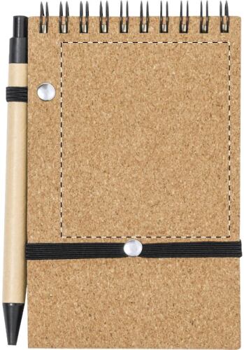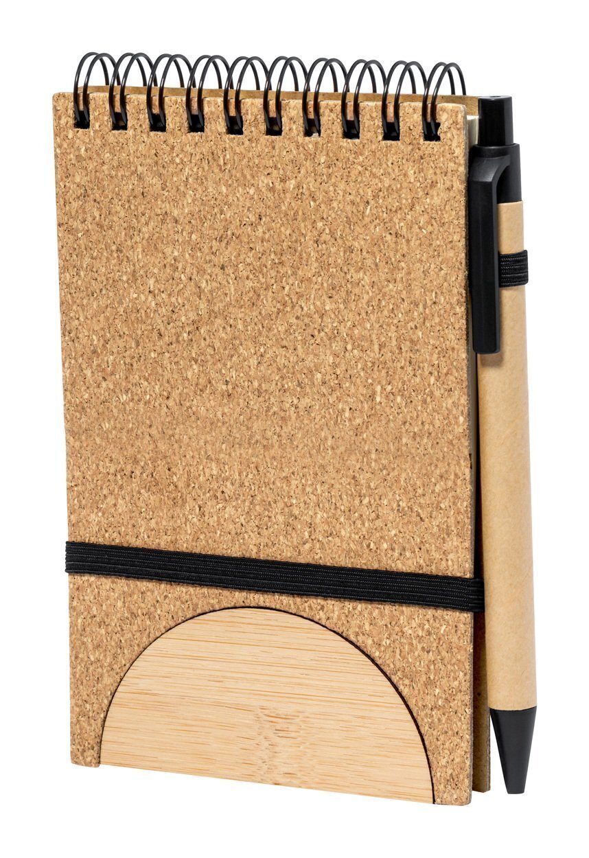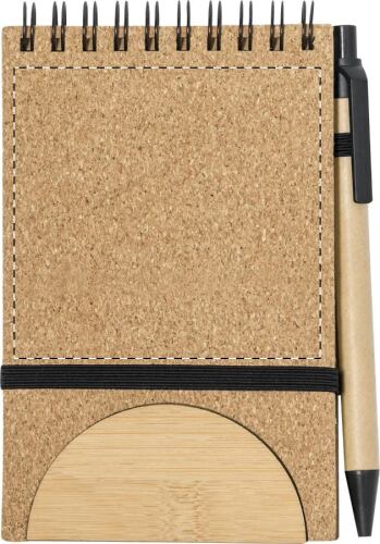 Quaderno a spirale con copertina in sughero naturale con 80 fogli a righe, inserto in bambù, elastico, portapenne e funzione portacellulare. Inclusa penna a sfera in carta riciclata con refill blu.