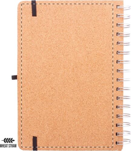 Quaderno a spirale formato A5, con copertina in sughero naturale, 70 fogli a righe in carta kraft riciclata, occhiello portapenne, inserto in plastica di paglia di grano per cellulare e tablet ed elastico di chiusura.