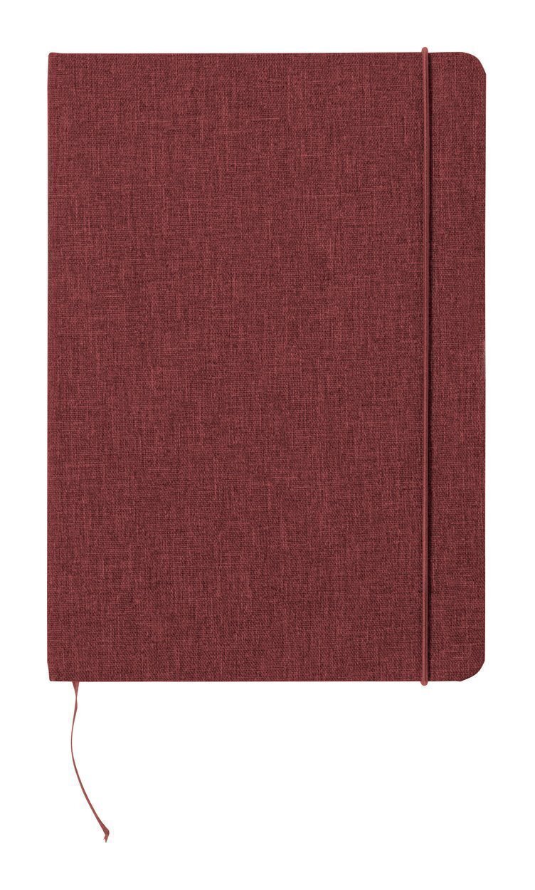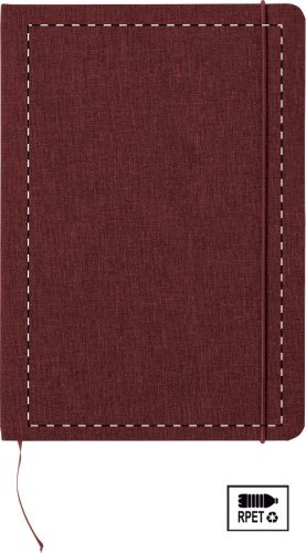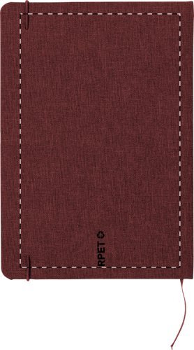 Quaderno formato A5 con 80 pagine bianche, copertina in poliestere 300D RPET, elastico colorato, segnalibro e porta penna.