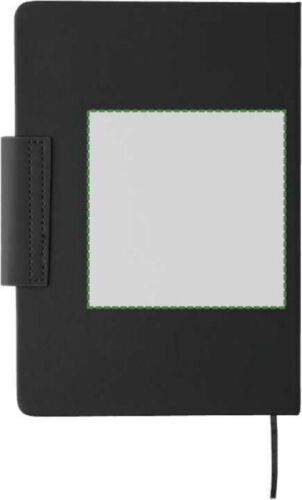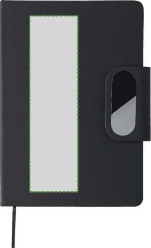Confezione regalo in cartone nero, composto da borraccia a doppia parete in acciaio inox riciclato 304 interno ed esterno e cinturino in silicone, penna a sfera a rotazione in alluminio riciclato con refill blu, e taccuino in PU riciclato con 80 fogli di carta a righe da 70?g/m² certificata FSC. Il taccuino è dotato di segnalibro e chiusura magnetica in metallo con targhetta effetto canna di fucile. Tutti gli articoli presentano il logo del materiale riciclato, inciso sulla borraccia e sulla penna, in rilievo sul taccuino.