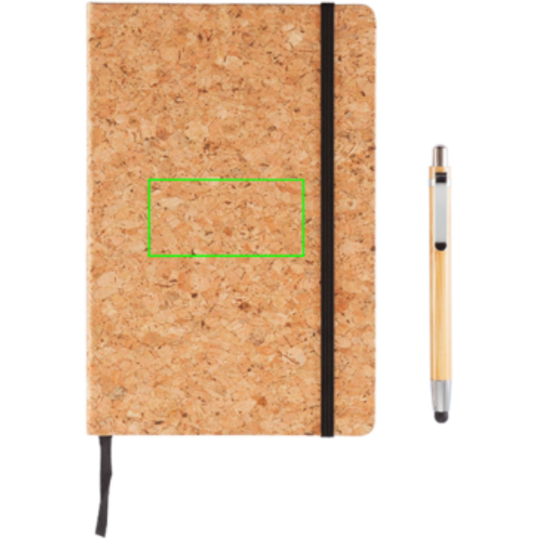 Taccuino per appunti ECO in sughero, ha 160 pagine da 80gr. Il separapagine e la banda elastica sono in colore nero. E’ fornito di penna in bambù con funzione di biro e punta touchscreen.