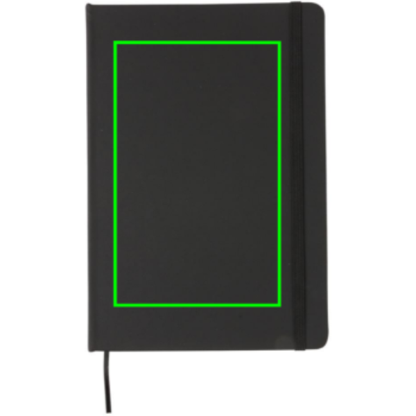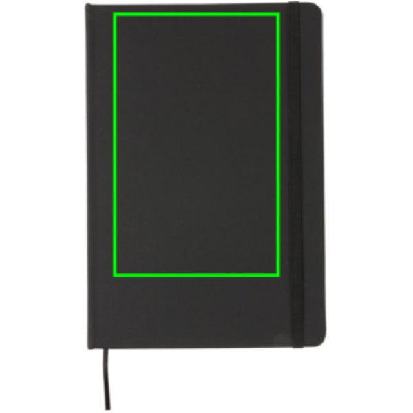 Taccuino A5 in PU con copertina rigida con chiusura elastica e nastro segnapagina nero. 144 pagine da 70 g/m2. Pagine color crema.