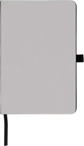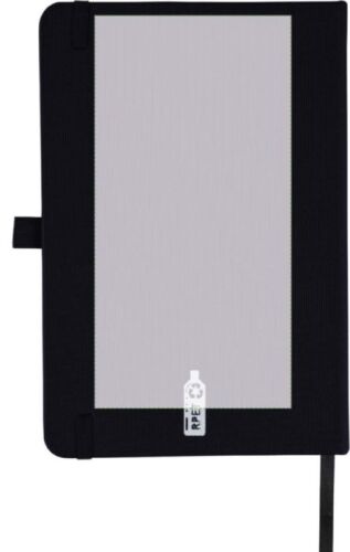 Taccuino formato +/- A5 in poliestere 600 D rPET con rivestimento in PU, contiene 80 pagine a righe 70 g/m², con segnalibro a nastro, elastico e passante per penna in tinta, copertina semi-rigida, include logo materiale "riciclato" a caldo sul retro.
